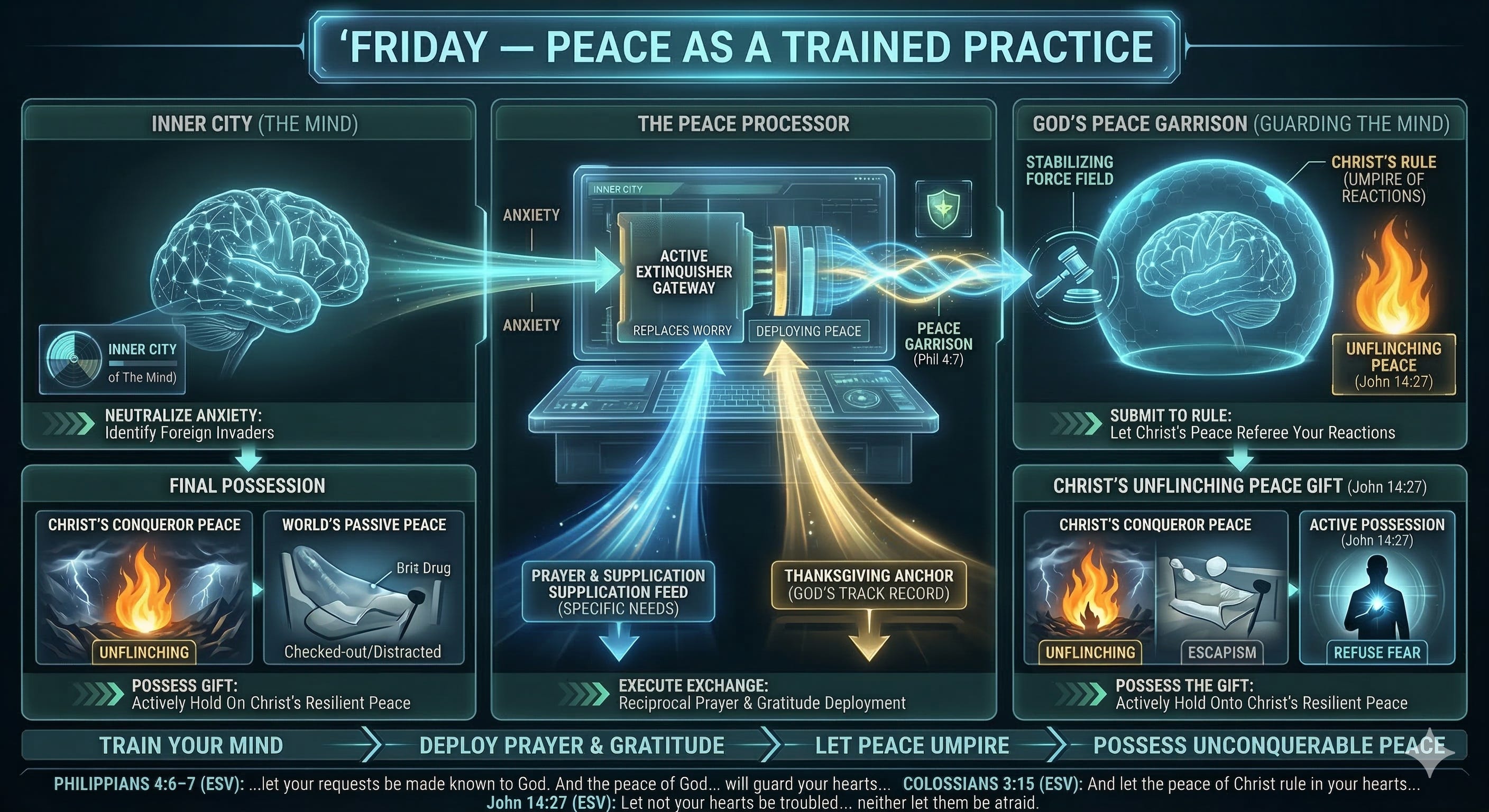 Thanksgiving is the anchor here. You cannot be locked in a state of panic while simultaneously giving thanks for what God has already done. It forces your brain to stop staring at the current threat and remember the track record of God. When you execute that exchange, God promises to deploy His peace as a literal garrison—a military guard—around your mind.